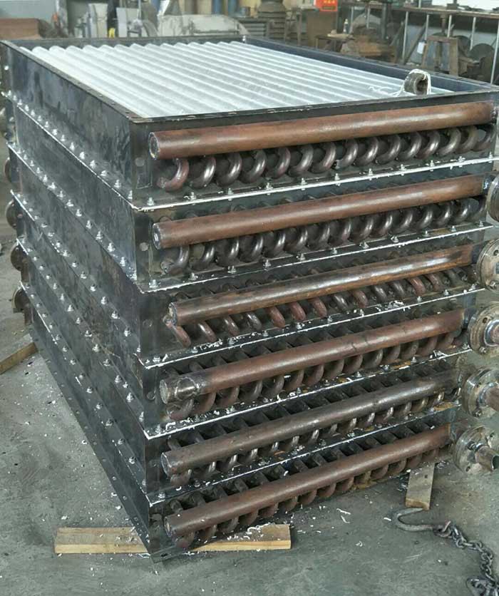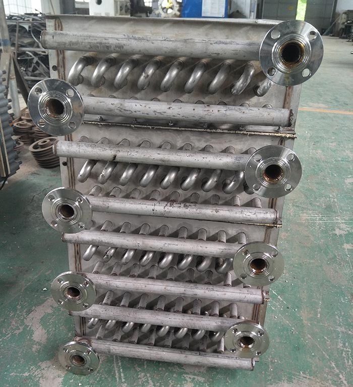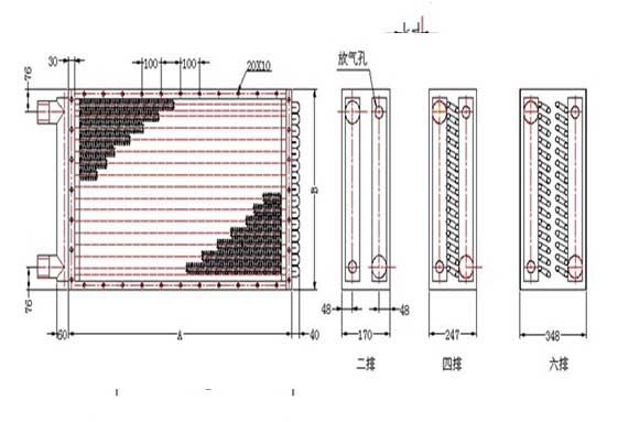 1.GLⅡ工業散熱器為鋼制雙回路(二排)、或多回路(四排、六排)結構,散熱管用Ф18*2mm無縫鋼管,經專機繞片10*0.3mm皺折鋼帶而成,呈螺旋狀,其片距為3.2mm,承壓高,耐腐蝕;2.GLⅡ工業散熱器的散熱排管全叉排排列,并個單獨彎頭管連接; 3.GLⅡ工業散熱器的散熱管特性: